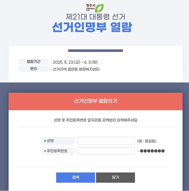 대통령선거를 앞두고 선거인명부 열람이 시작됐습니다. 내 정보가 정확히 등록됐는지 지금 바로 확인하세요. 빠르게 선거인명부 열람하시려면 아래 버튼에서 확인하세요.