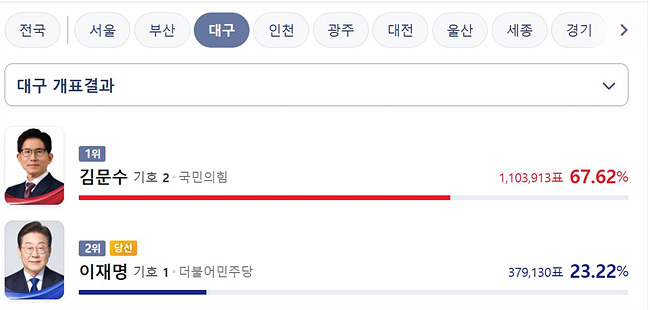 | 1위 | 김문수 | 국민의힘 | 1,123,843표 | 51.99% |