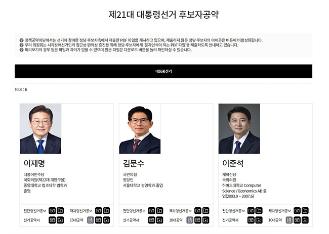 **제21대 대통령선거에 참여한 정당 및 후보자들이 제출한 정책 및 공약 자료(PDF 형식)**를 유권자들이 쉽게 열람할 수 있도록 구성된 온라인 공간입니다.