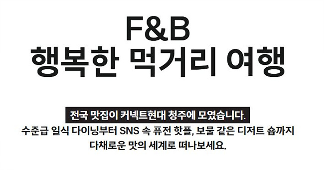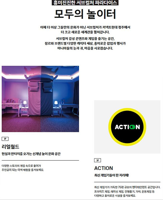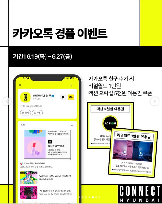 충청 지역에 새롭게 떠오르는 복합 문화 쇼핑몰, 커넥트현대 청주가 6월 27일 공식 오픈합니다. MZ세대를 겨냥한 젠지 감성 콘텐츠부터 무신사, 이케아, 마뗑킴 등 지역 최초 브랜드, 방탈출·피규어·굿즈 등 서브컬처 콘텐츠까지, 지금껏 본 적 없는 경험이 펼쳐집니다. 단순 쇼핑을 넘어서 문화와 예술, 지역 감성까지 모두 연결된 플레이그라운드, 커넥트현대 청주를 지금 만나보세요.