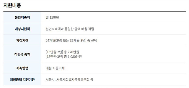 - 2년형: 월 15만 원 저축 → 서울시가 15만 원 추가
