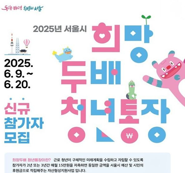 2025년 서울시 ‘희망두배 청년통장’이 참여자를 모집합니다. 월 15만 원 저축 시 동일 금액을 서울시와 민간이 추가 적립해주는 이 제도는 근로 청년이 단기간에 목돈을 마련할 수 있도록 도와주는 대표적인 자산 형성 지원 사업입니다. 신청 조건이 완화되고 선발 방식도 개선되어 더 많은 청년이 공평하게 혜택을 누릴 수 있게 되었어요. 청년 재테크의 첫걸음을 시작하고 싶다면 지금 바로 신청 방법을 확인해보세요! 빠르게 희망두배 청년통장 신청을 원하시면 아래 신청 바로가기를 확인하세요.